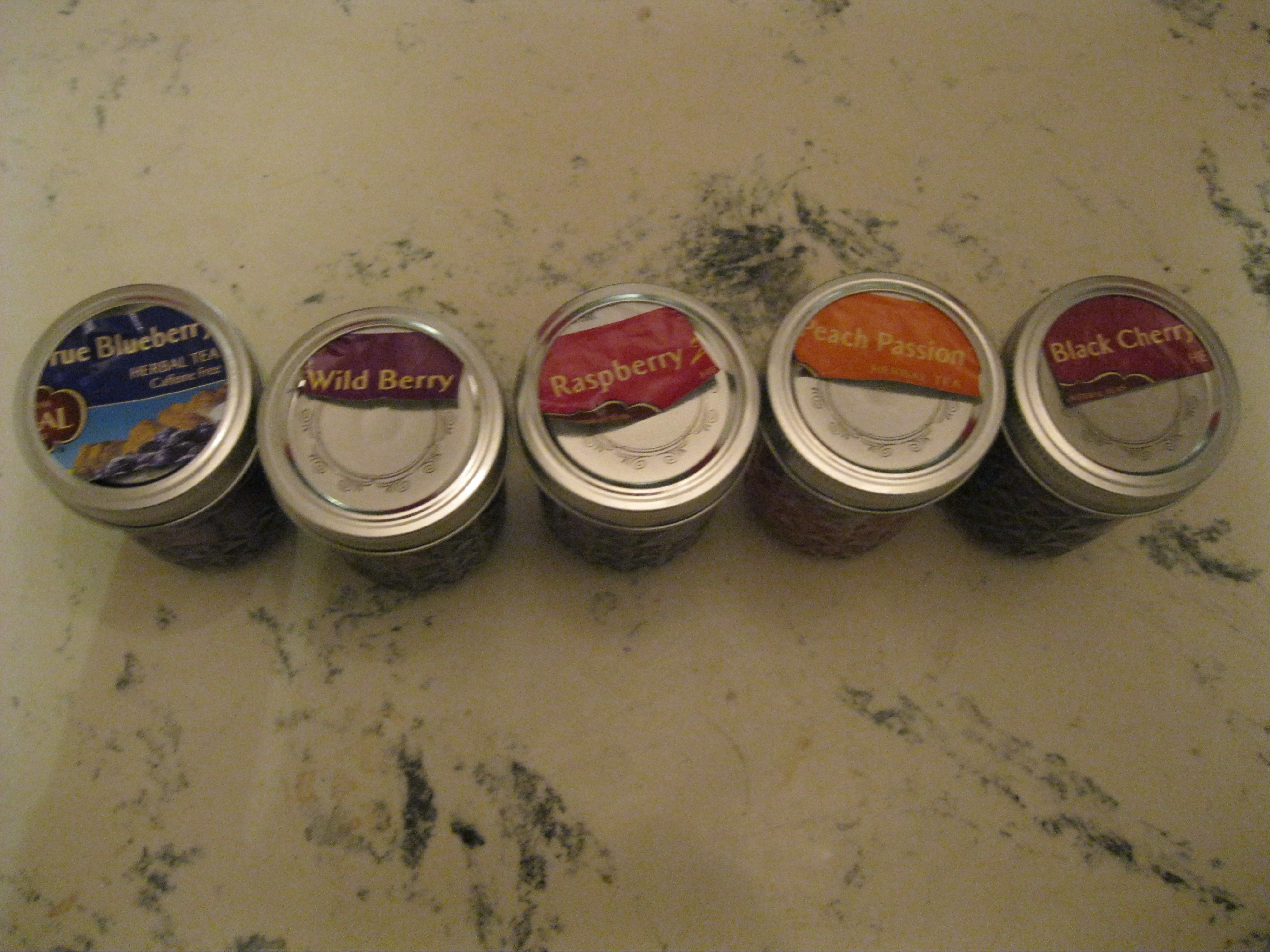 In each of the 8 oz jars I used 4 tea bags.  This is created an extremely strong flavor.  If you prefer a lighter flavor, you could use more water or fewer bags.  I used a tea kettle for boiling the water and added it to each of the jars.  I saved the packaging to keep the flavors straight.