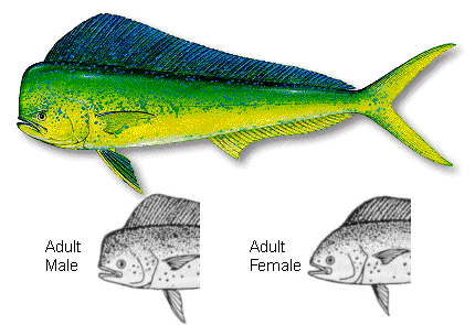 Male mahimahi have a very pronounce forehead that is not found in the females. Both sexes are very colorful.