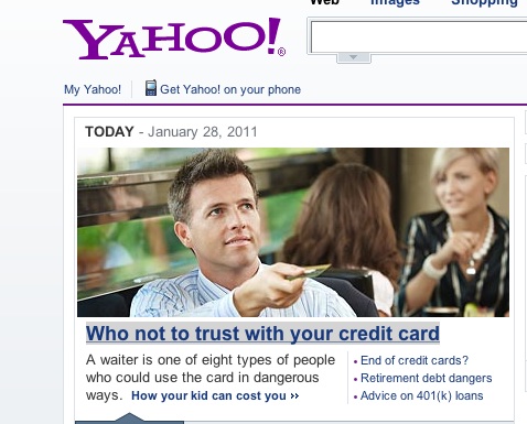 As discussed yesterday, Yahoo ran a front-page story from creditcards.com on Friday discussing types of people who you cannot trust with your credit card. The Yahoo headline is pictured above and makes it clear that servers are on the list. While the actual article includes eight groups, the headline very clearly implies that you should be worried about handing your credit card over to a server. What the headline does not mention is that you, your kids, and your loved ones are also on this list. Does anyone else already smell the sensationalism?